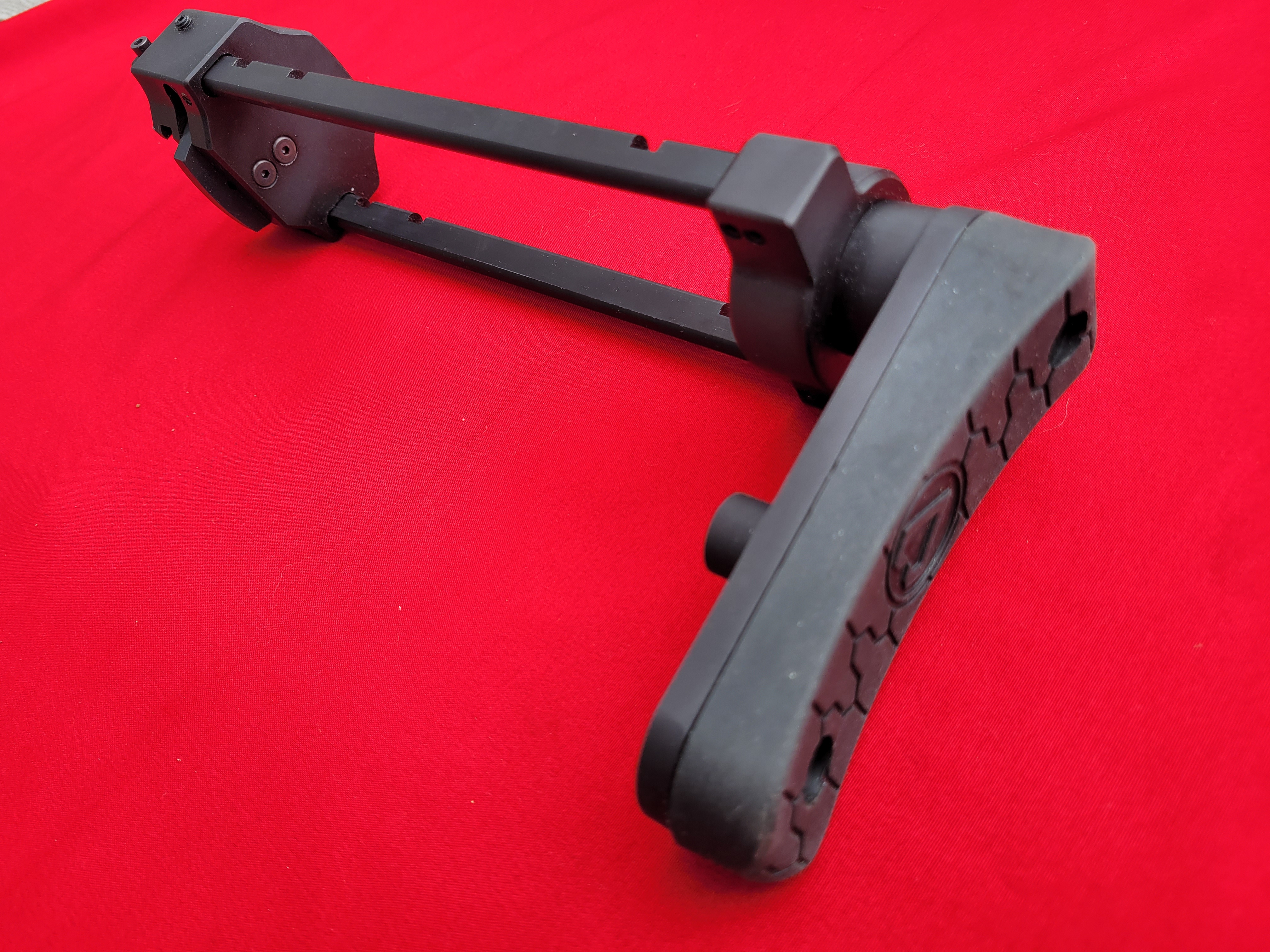 This is our new UZI Pro Pistol PDW Style Brace/Stock Assembly. Designed to fit the Pro Pistol Perfectly and slide onto the factory frame slots. Low mounted rods along the frame clear the bolt port and selector switch perfectly. We maintained the factory drop and even added additional Buttplate/brace height adjustment to the rear plate. Only adds apx 2" to rear with Tailhook setup. Extends to apx 14.5" length of pull depending on rear option (same as the factory Brace) The Ergonomics are outstanding with the Tailhook option. Allowing perfect wrist support when fully collapsed or on the arm when extended. Options include a Tailhook Mod 1 Aluminum Brace, SB Tactical Rubber Brace or a Ace Ultra Light Buttplate with rubber pad. Also available with just a mounting stud for the Tailhook for those that already own one. All 6061 Aluminum CNC manufacturing finished in Black Anodize. Telescoping Rods are made from high strength 2024 Aluminum. Easily secures with two High Hold setscrews into the rear of the frame.