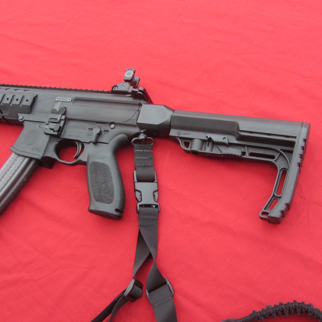 These are newly designed MPX Stock mounts mated with an adjustable length MFT stock. . Slide over rear rail and attach with included soft tipped set screws.(No big bolts) Creates a ROCK SOLID stock that feels perfect against your shoulder and adjusts from 8-1/4 to 11.5 in long. Very nice cheek weld in any position with no small rails to dig into face. Longer length of pull adjustment feels much better without body armor or heavy coats on,and taller shooters will appreciate the extra room. Easy one finger adjustment and has a nice padded butt plate. These slide in and out and do not fold. Includes allen wrench. On and off in 3 MINS ! Mount is CNC Machined from 6061 Alum