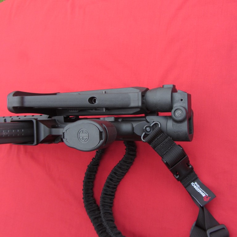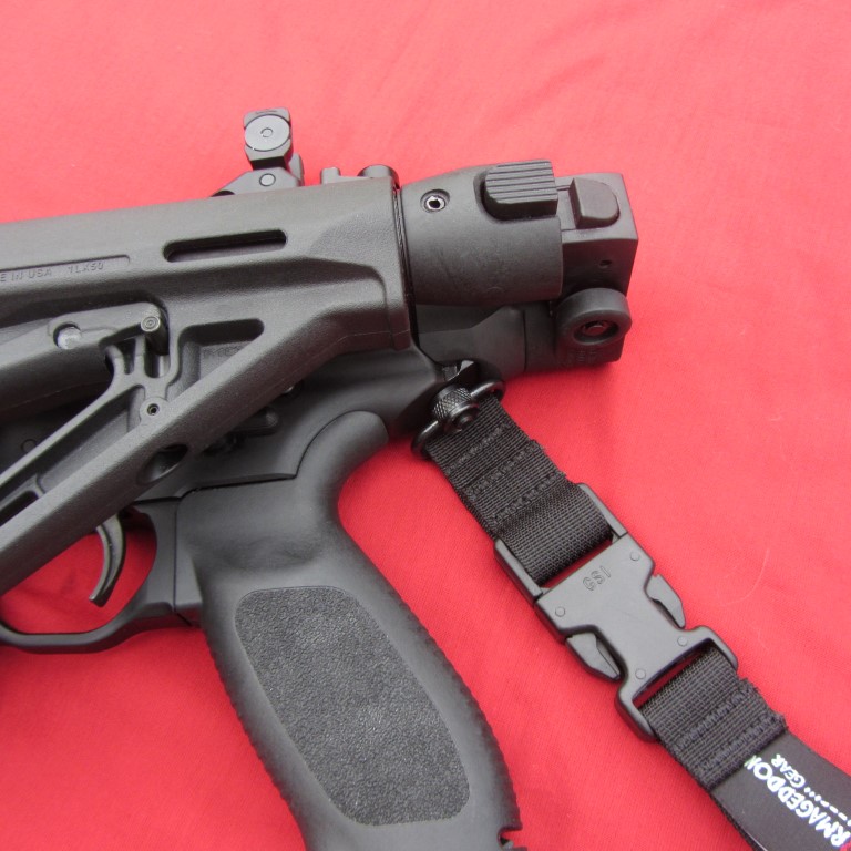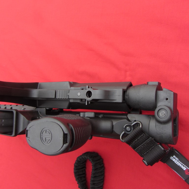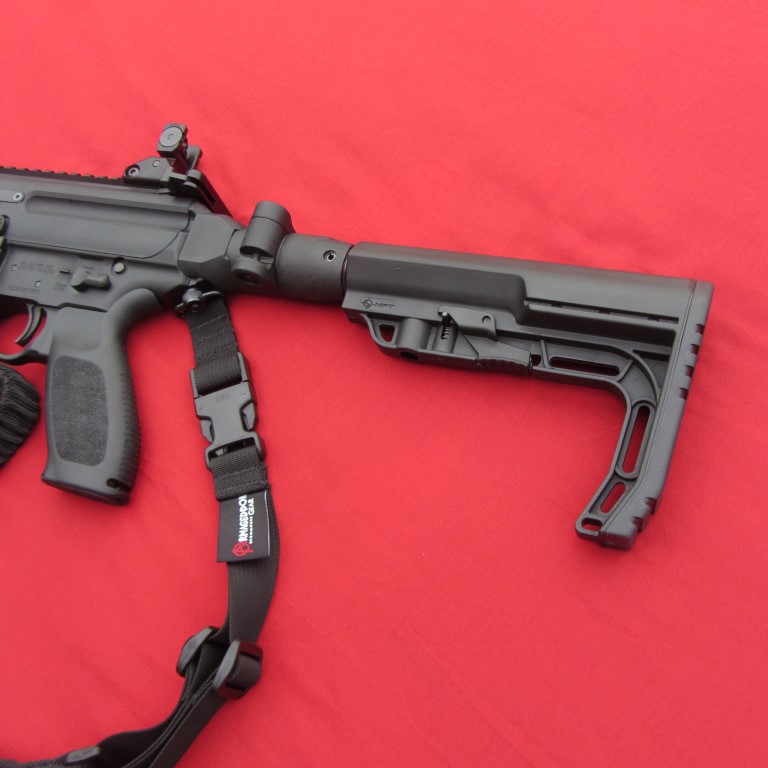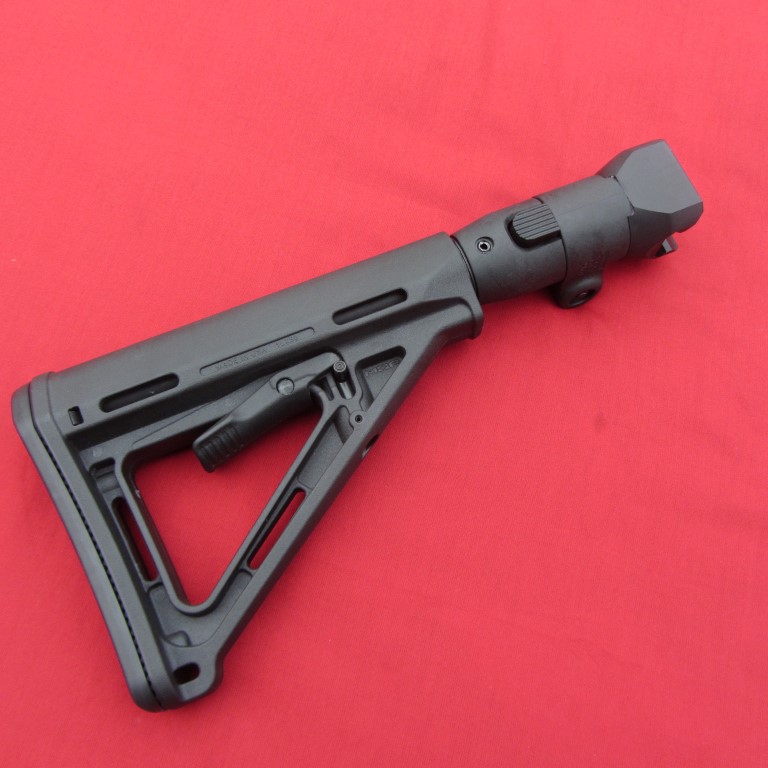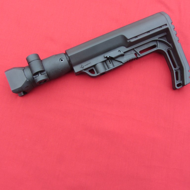 This is a newly designed folding stock for the MPX Pistol. We used one of the famous Fab Defense Polymer stock hinges as the starting point and custom adapted it to the cool MPX with our own CNC cut 6061 aluminum adapter. These are very solid platforms and lock up extremely tight when opened. They are spring loaded in the closed position and will lock closed with smaller profile ( thinner ) AR style buttstocks gently against the frame.. These mount by simply sliding the stock onto the rail and securing with the included Nylon tipped set screws . Takes less than 3 minutes to take on and off. We chose a couple different type butt stocks that fit the frame nicely when open as well as closed against the frame, while at the same time being very functional and visually appealing on this platform. These are 6 position commercial sized tubes and stocks slide in and out apx 3".