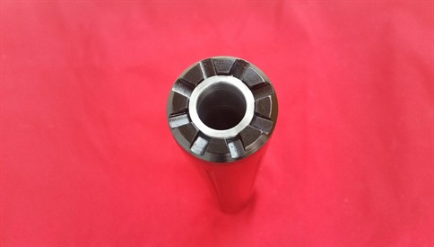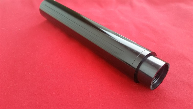 This is our new Fluted UZI Fake Suppressor with a slotted front end. Steel mount and chrome moly barrel liner slides over your existing 16" Carbine barrel and replaces the Barrel nut with a original style mount with ratchet teeth. Hot tanked oxide on the mount with a 1.5" OD Black Anodized 6061 aluminum wrapping. One piece sealed construction with no open volume and no sound reduction. 9.5" long overall, apx 13oz. Cover that long ugly barrel and make that UZI look like it should look. Fits all original and clone Full Size models with a 16" barrel. The BEST made ! Dealer discounts available in QTY